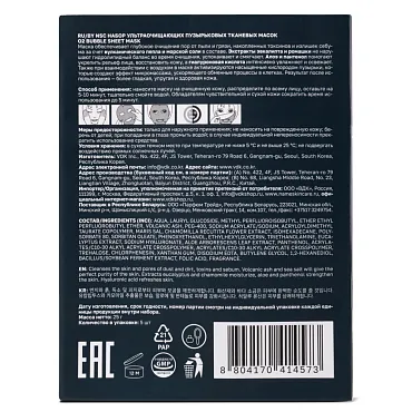Набор из 5 пузырьковых тканевых масок в подарочной коробке. Пузырьковая маска обеспечивает глубокое очищение пор от пыли и грязи, накопленных токсинов и излишек себума за счет вулканического пепла и морской соли в составе. Экстракты эвкалипта и ромашки не нарушают гидролипидный баланс во время очищения, успокаивают и смягчают. Алоэ и пантенол помогают укрепить рельеф лица, восстановить кожу, а гиалуроновая кислота интенсивно увлажняет и освежает. Также при взаимодействии с воздухом в маске активизируются насыщенные кислородом пузырьки, которые создают эффект микромассажа, ускоряющего обменные процессы в клетках. Результат после использования — более гладкая, упругая и здоровая кожа.